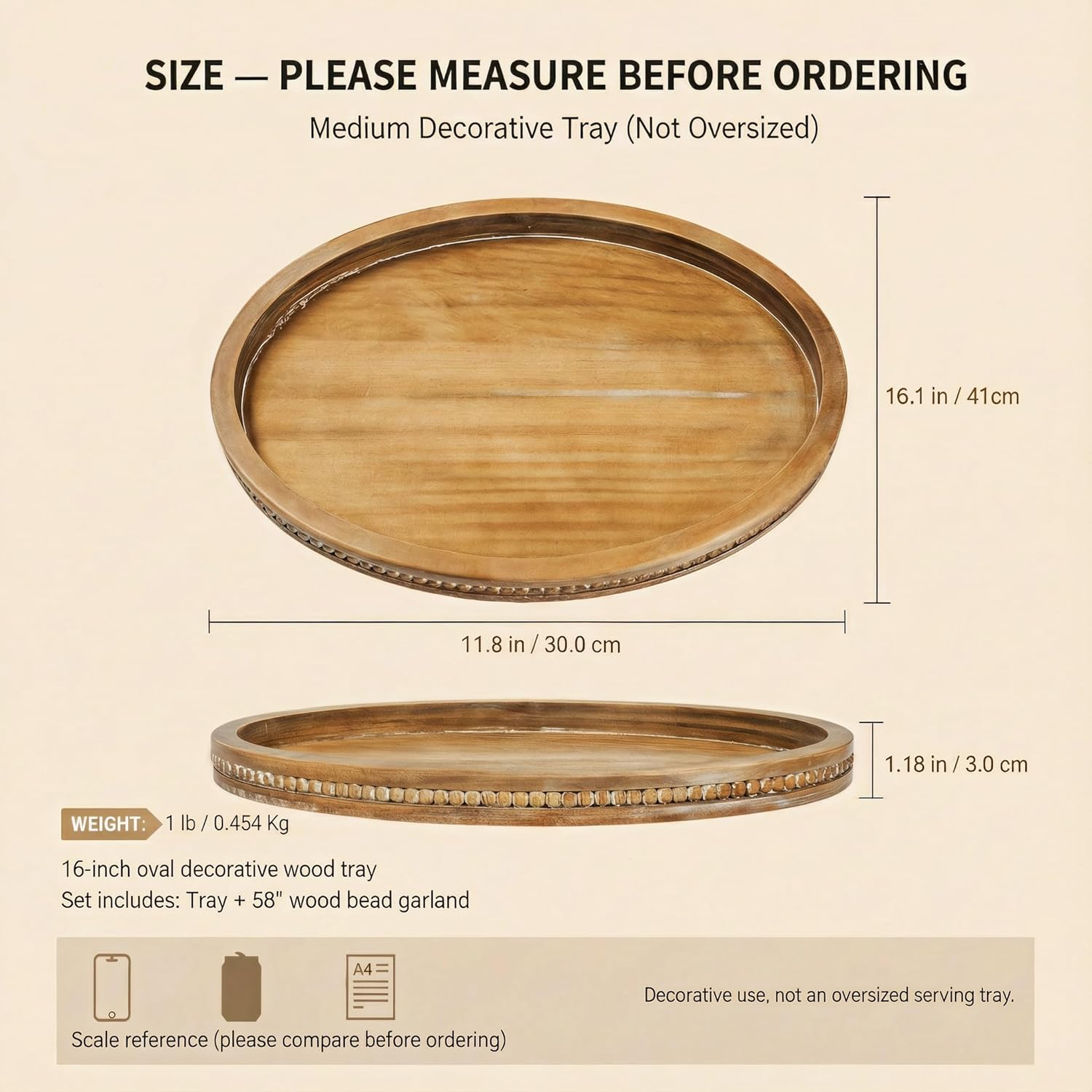 𝐈𝐧𝐜𝐥𝐮𝐝𝐞𝐬 𝐌𝐚𝐭𝐜𝐡𝐢𝐧𝐠 58″ 𝐖𝐨𝐨𝐝 𝐁𝐞𝐚𝐝 𝐆𝐚𝐫𝐥𝐚𝐧𝐝 — You’ll receive 1 oval decorative tray + 1 wood bead garland (58 in / 148 cm). Style it instantly with candles, greenery, a small vase, or seasonal accents.