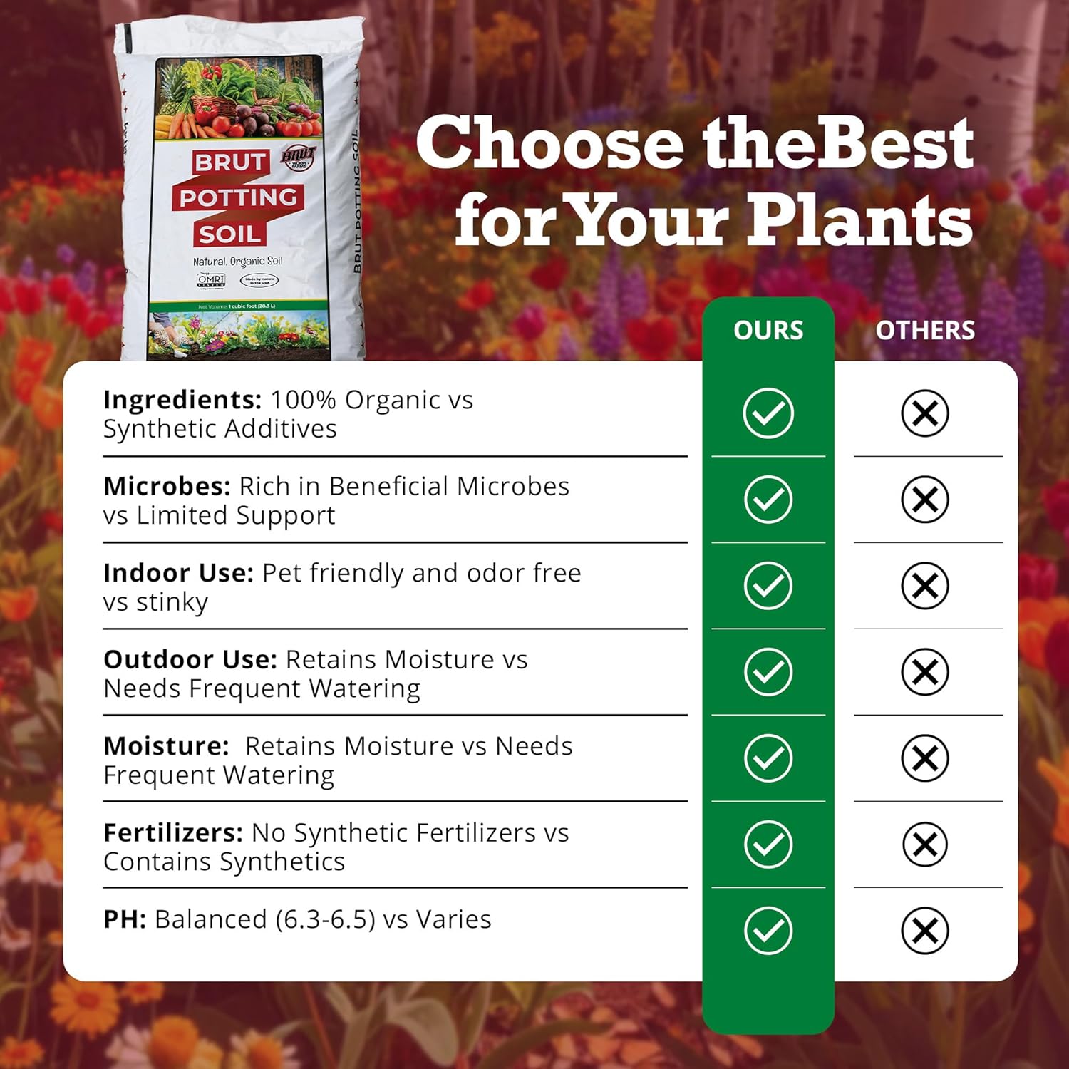 PURE, FILLER-FREE: Say goodbye to the worry of unknown ingredients. It is pure and filler-free, with no sticks, wood chips, or artificial additives. Brut Organic Potting mix is naturally pH balanced between 6.3 and 6.5, making it perfect for most plants.
