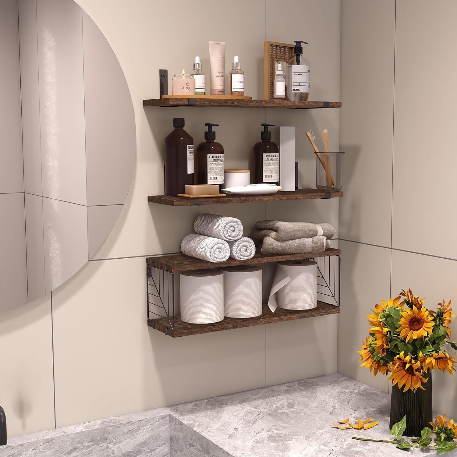 [Functional Floating Shelves]- Our product is meticulously designed to fulfill both your decorative and organizational requirements. Our floating wall shelves with a extra storage basket perfectly complement rustic/modern farmhouse, as well as traditional/industrial styles. They bring a warm and charming atmosphere to your bedroom, living room, bathroom, office, and kitchen. These shelves can serve as floating plant shelves, bookshelves, toilet paper storage shelves, or even cat shelves.