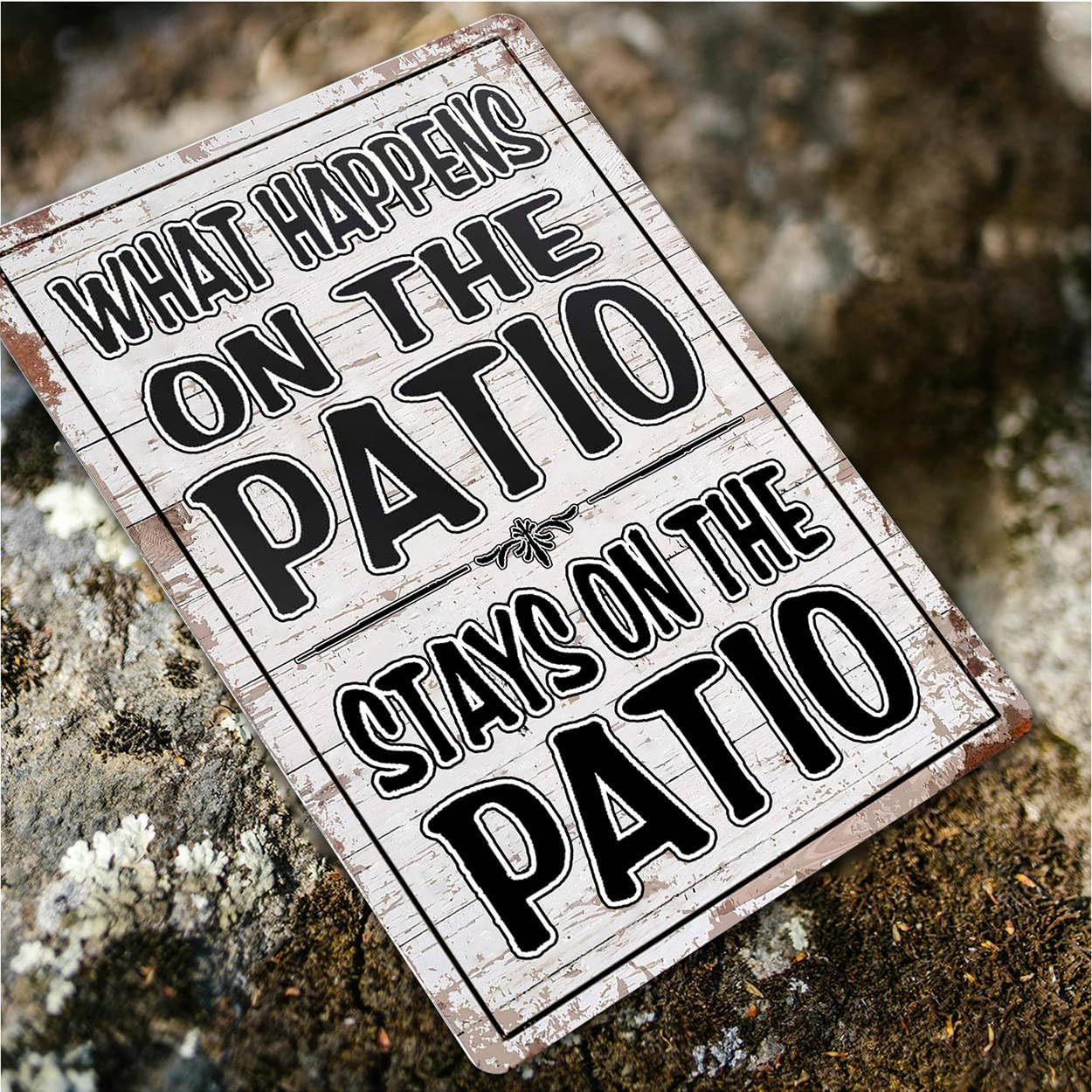 Vintage Patio Metal Signs USE : With text that reads “What Happens On The Patio Stay On The Patio” . The graphics and wordings of metal signs will withstand the elements and will not fade over the years.