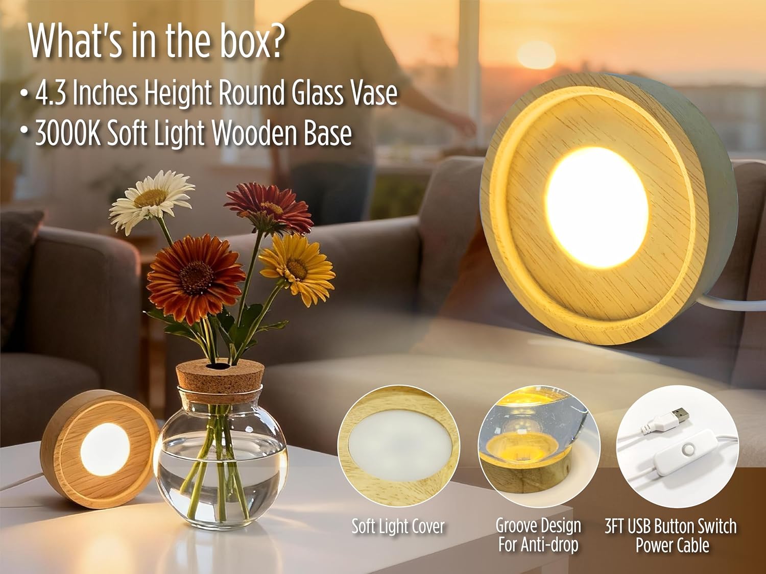 Material and Dimensions: Round Plants Terrariums: L4″ x W4″ x H4.33″ ,LED Lighted Wooden Base: L3.15″ x W3.15″ x H0.88″, 3000K Warm White LED with Wooden Stand – Create the perfect ambiance! Our planter features a beautifully hand-crafted wooden stand with a soft light-diffusing acrylic cover