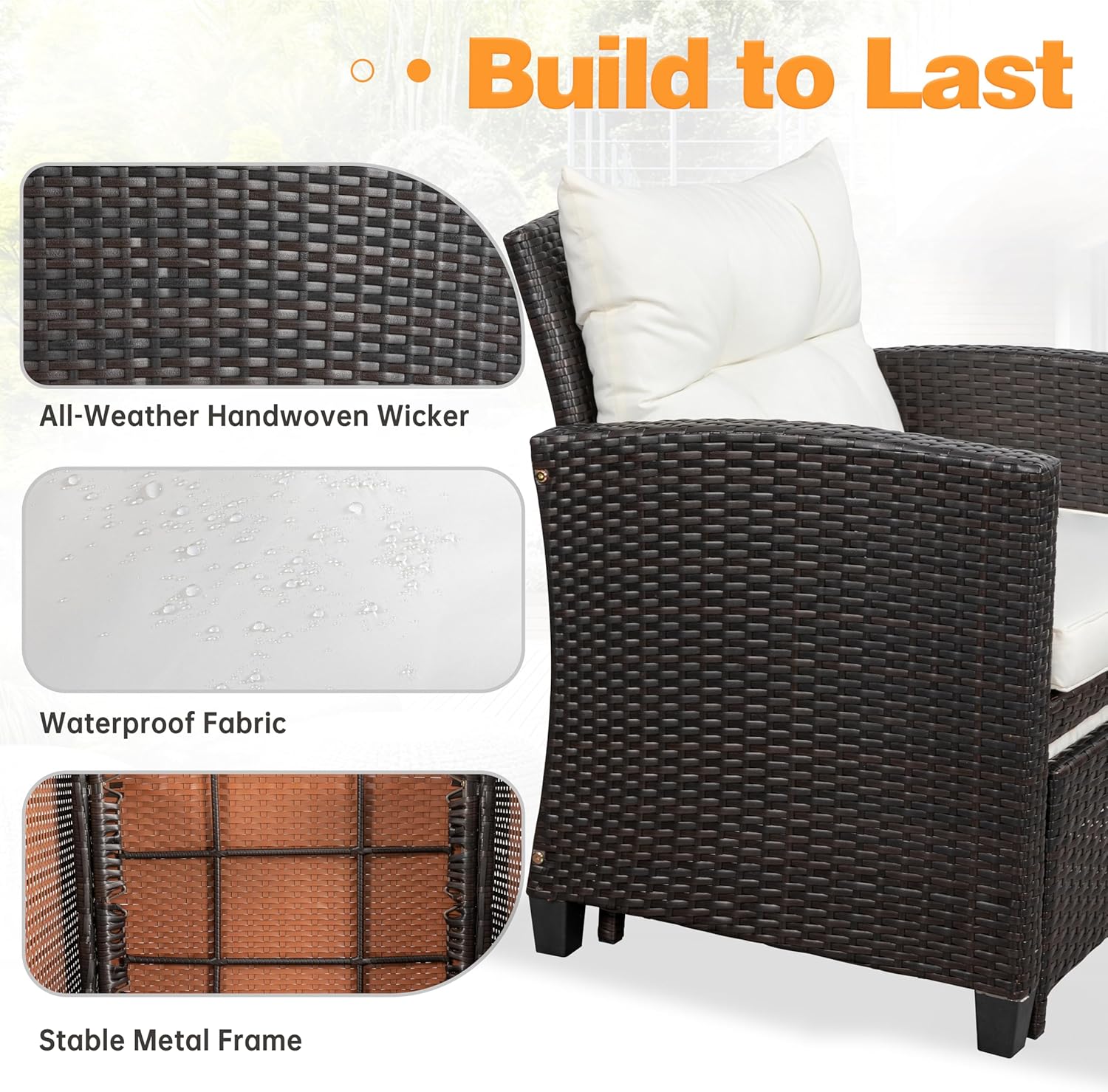 All-Weather PE Wicker Build: Durable PE rattan resists sun, rain, fading & cracking. Natural texture adds outdoor charm with low maintenance—simply wipe clean. Lightweight yet tough for patio, deck, or poolside use year-round.