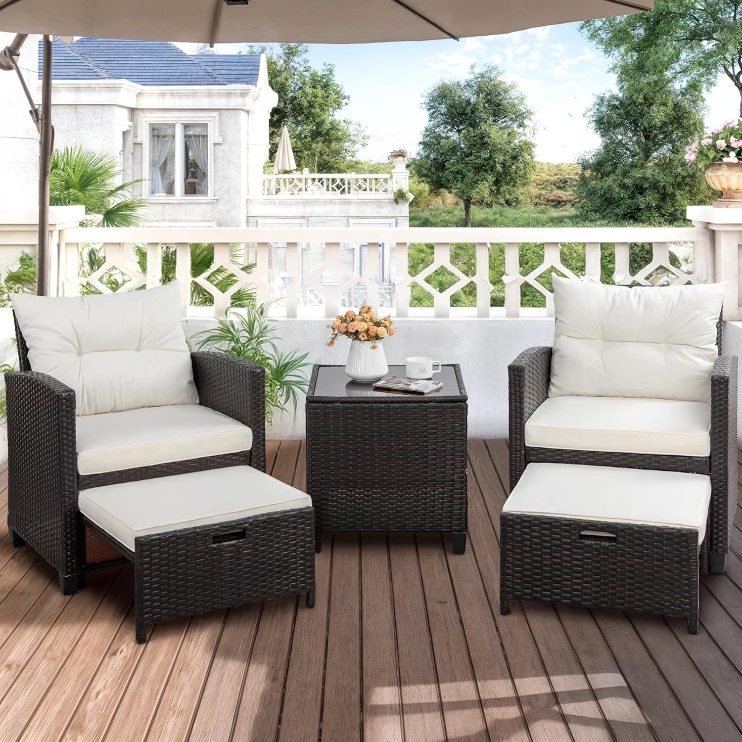 Shintenchi 5 Pieces Patio Furniture Set, Outdoor Wicker Patio Conversation Set with Ottoman, All Weather Rattan Outside Chairs with Coffee Table & Cushion for Porch, Garden, Backyard, Beige