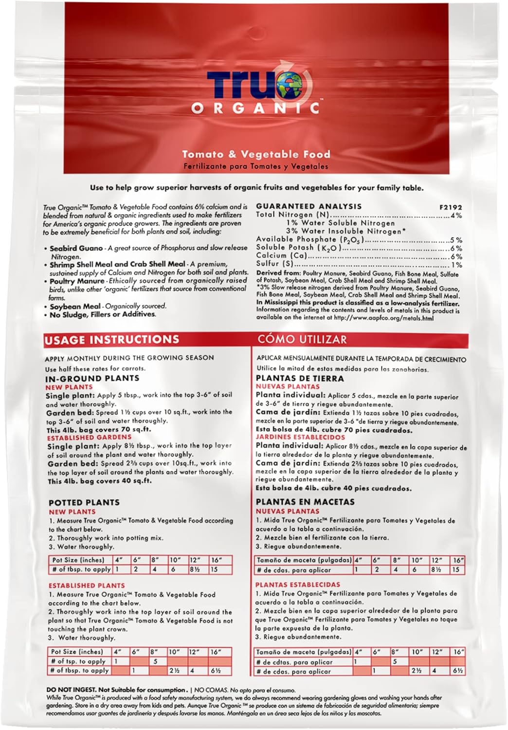 Achieve a superior harvest with True Organic™ Tomato & Vegetable Food, an all-natural fertilizer designed to support the growth of robust fruits and vegetables. This nutrient-rich formula includes 4% nitrogen (with 3% slow-release nitrogen), 5% phosphate, and 6% potash, providing balanced nourishment throughout the growing season. Fortified with 6% calcium, True Organic™ Tomato & Vegetable Food helps prevent blossom end rot, a common issue in tomatoes and other vegetables, ensuring healthier, more productive plants. It also includes 1% sulfur for enhanced nutrient absorption and soil health. Crafted from eco-friendly ingredients such as poultry manure, seabird guano, fish bone meal, shrimp and crab shell meal, and soybean meal, this organic fertilizer benefits both plants and soil. True Organic™ Tomato & Vegetable Food is available in various sizes to fit your gardening needs. The 4lb bag covers up to 70 sq. ft., the 4.5lb shaker jug covers up to 78 sq. ft., the 8lb bag covers 140 sq. ft., the 12lb bag covers 210 sq. ft. and the 25lb covers 438 sq. ft. Apply monthly during the growing season for optimal results in both in-ground and container gardens. Choose True Organic™ Tomato & Vegetable Food for vibrant plants and bountiful, organic harvests!