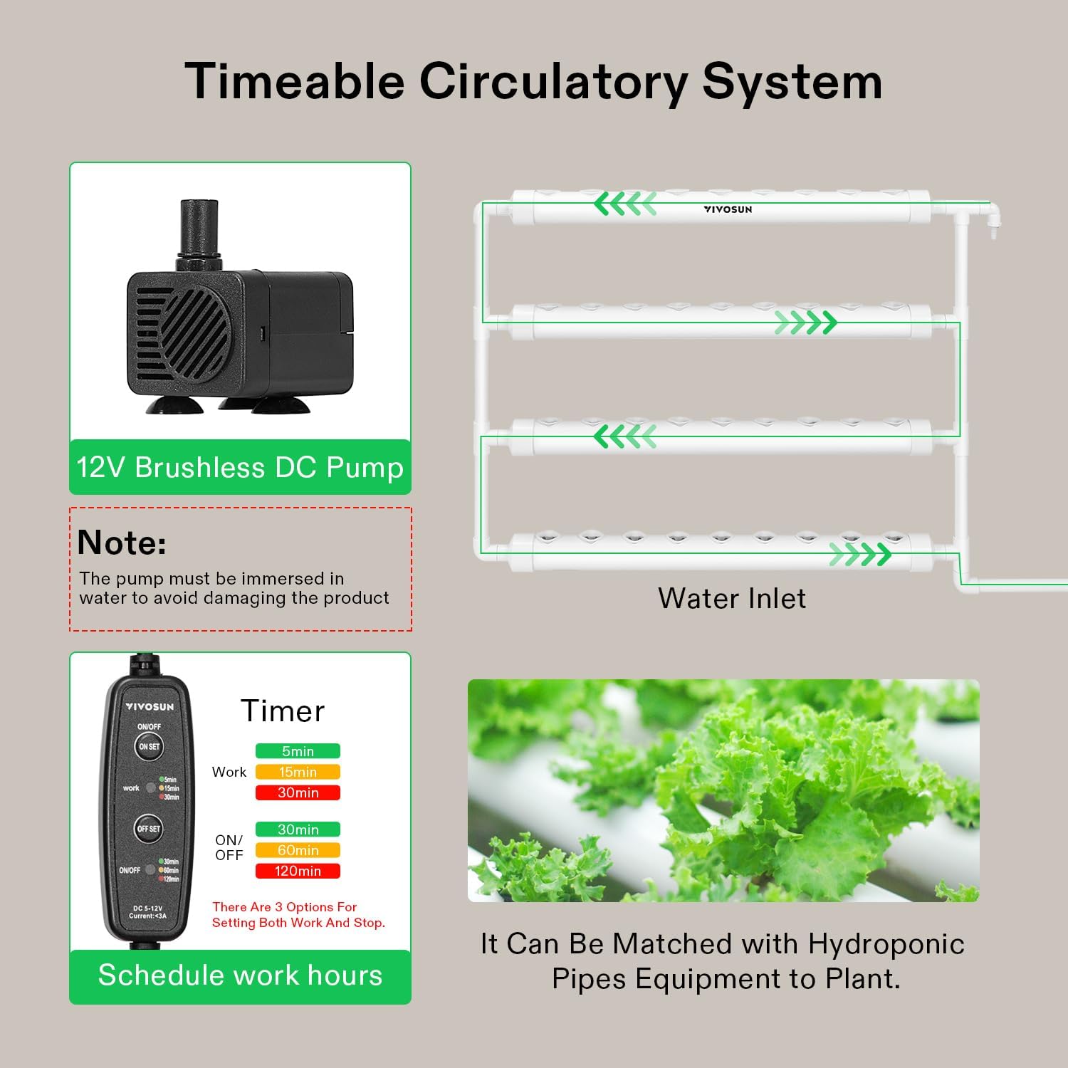With Timer to Save Effort: This hydroponic planting system kit of PVC has a timed circulation system; The default setting of the timer allows the pump to work for 5 minutes every 30 minutes to reach the nutrient film technique; The circulation mode can also be set manually or automatically according to demand; Not only makes the pump more durable, saves nutrient solution, but also makes vegetables grow better